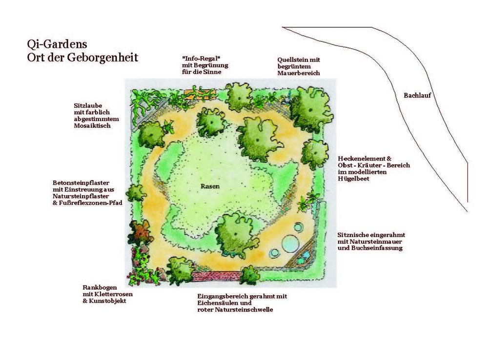 Qi-Gardens kombiniert die Stilelemente verschiedener Gartenepochen. Die geschwungenen Linien bei Wegeführung und Beetgestaltung erzeugen einen harmonischen Eindruck. Horizontale und vertikale Strukturen ergeben eine Kombination aus Rückzugsmöglichkeiten und Situationen, die den Ein- und Ausblick gewähren. Dies bietet Schutz und Geborgenheit, Naturerlebnis und -genuss. Wie ein Puzzle setzen sich Qi-Gardens-Gärten aus den vorhandenen Gegebenheiten und neuen Elementen zusammen. Einflüsse aus europäischer Garten- und Landschaftsgestaltung, Feng Shui Aspekte, Vorgaben durch Bewohner und Umgebung etc. fließen ein und führen zum individuellen einzigartigen Ergebnis.