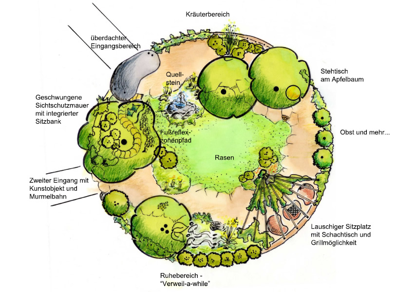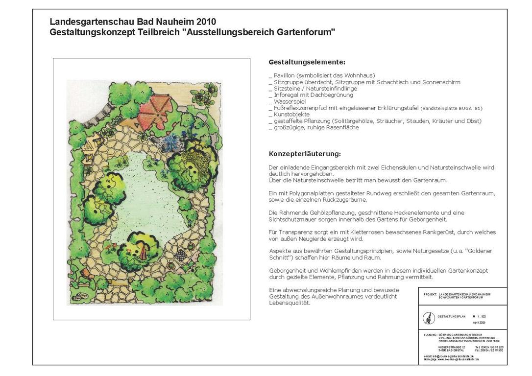 Um einen Garten entsprechend dieser Grundlagen auf der LGS 2010 in Bad Nauheim präsentieren zu können, wurde in Zusammenarbeit mit der freien Garten- und Landschaftsarchitektin B. Sörries-Herrnkind und der GaLaBau Firma Stolle diese Fläche mit seinen Elementen aus Bilder-, Wandel-, Zier- & Nutzgärten geplant /gestaltet. Dabei wurde Wert auf ein harmonisches Konzept gelegt, welches Geborgenheit, Wohlempfinden, Urlaubsgefühle ganzjährig erlebbar machen. Grundstücke haben Grenzen, die durch gestaltete Rahmung klar definiert sind, Schutz und Geborgenheit vermitteln.