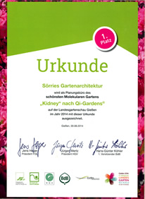 Ein Spaziergang: Das "Kidney"-Tor bildet den nördlichen Eingang in den Garten. Der Blick wird hier auf den sprudelnden Quellbereich gelenkt. Im Nordosten begrenzen Kräuterschalen – Elemente und ein mit Weinreben berankter Zaun den Garten nach außen. Das Zentrum des Gartens besteht aus einer ruhigen Rasenfläche. Im Anschluss an das Duftbeet mit Staude, Rosen und Kräutern erreicht man den „Tree-Tunnel“ aus den Kronen zweier Apfelbäume. Im Südosten dienen Obststämmchen der Abgrenzung. Nun geht man durch den romantischen Laubengang mit Rosen. Hier ist ein Schachtisch integriert und lädt zum geistigen Kräftemessen ein. Im Südwesten folgt eine Sitznische mit gestalteter paarigen Holz -Sitzmöglichkeit zum Ausruhen oder zum gemütlichen Plausch. Der Weg führt weiter vorbei an der Magnolie. Entweder verlässt man „Kidney“ durch den nordwestlichen Eingang oder geht über den Fuß-Reflexzonen-Pfad entlang der geschwungenen Mauer, verweilt auf der integrierten Sitzfläche und genießt das Glitzern des Wassers im Sonnenlicht am sprudelnden Quellbereich.